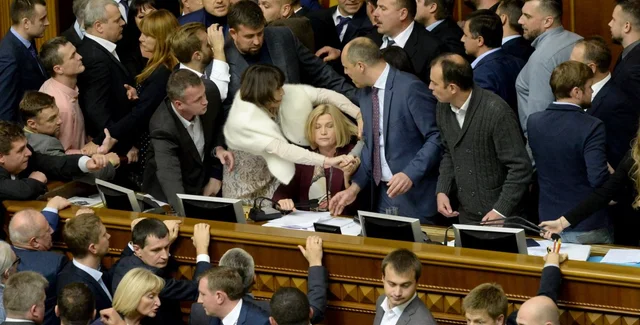 Сначала депутаты от "Самопомощи" Егор Соболев и Виктория Войцицкая начали выкручивать микрофоны на рабочем месте спикера парламента. Самого Андрея Парубия не пускали на рабочее место. Возле президиума произошла потасовка.