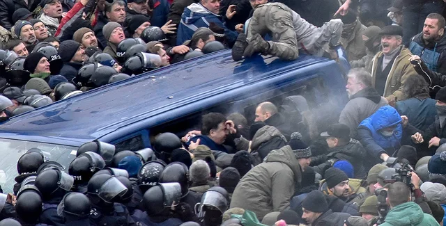 После того, как сотрудники СБУ вывели из здания Саакашвили, даже его адвокаты не знали, куда собираются везти их подзащитного. Один из сопровождавших Саакашвили сбушников признался Фокусу, что была команда везти экс-президента на допрос в здание СБУ на улицу Воровского. Впрочем, далеко уехать микроавтобусу силовиков не удалось: в районе Украинского дома он был заблокирован сторонниками Саакашвили. Правоохранители не единожды пытались оттеснить людей, но тщетно. Разгромив авто, люди буквально вынесли Саакашвили на улицу, взяв в плотное кольцо. Вскоре он уже выступал прямо под открытым небом. "Вы не дадите этим необразованным барыгам управлять собой и страной. Я призываю выйти на улицу и собраться на Майдане, начав процесс избавления от Порошенко и его банды! Я четыре часа провел в автомобиле СБУ, говорил с сбушниками и могу вас заверить: они ненавидят эту власть, как ненавидят ее и полицейские. Поэтому не надо боятся. Нас миллионы и мы очень сильные. Украинцы — самый великий народ Европы", - убеждал собравшихся Саакашвили.