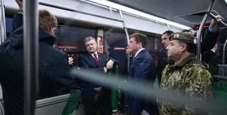 Президент Украины Петр Порошенко во время рабочей поездки во Львов проехался по городу на первом в Украине электробусе "Электрон".