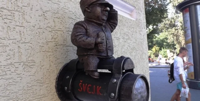 Автор скульптуры - Михаил Колодко, на счету которого еще два подобных Швейка. Один из них находится в чешском городке Липнеце-над-Сазавой. Именно там заканчивал писать последние тома "Приключений бравого солдата Швейка" Ярослав Гашек. Второй - в Ужгороде. Здесь Швейк сидит на перилах, прострелянных пулями во время Второй мировой войны над речкой Уж, с кнедликом в руках.