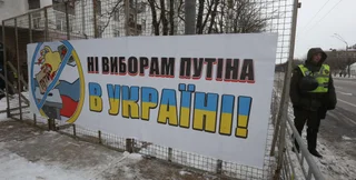 Также участники акци вешают на металлический забор огромные плакаты с протестом против выборов в оккупированом Крыму. В частности, на них написано: "Геть московських окупантів-холуїв!" и "Ні виборам Путіна в Україні!".