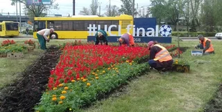 Сотрудники Киевзеленстроя вдоль трасс устанавливают тематические цветочные панно и конструкции объемных надписей с использованием официального хэштега #UCLfinal.