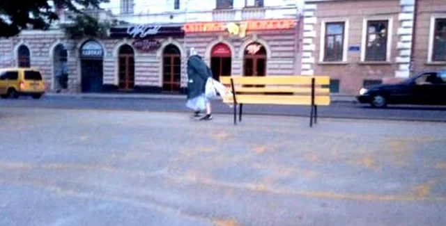 На видео видно, как пенсионерка тащит за собой скамейку прямо через центр города. Очевидцы говорят, что это не первая лавочка, унесенная бабушкой из центра.