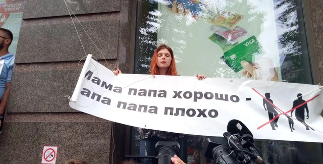 Около двух десятков противников марша с плакатами в духе "Закон для семей – Украина для семей", скандируют лозунги "Украина – не Содом", "Кличко и Киеврада – мы против гей-парада".