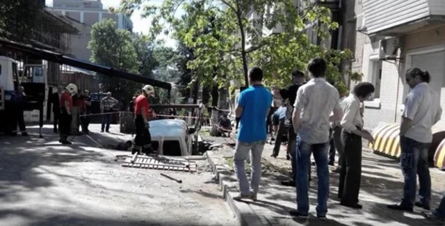 В Киеве в понедельник, 18 июня, в районе улицы Ярославов Вал автомобиль провалился под асфальт.