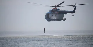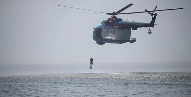 На ходу с 7-метровой высоты пограничные дайверы без парашютов прыгали с вертолета в воду