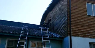 Прибывшие на место происшествия спасатели установили, что на кухне на втором этаже здания произошло возгорание деревянной стены.
