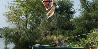 В Кременчуге (Полтавская область) на Днепре была замечена лодка с российским и советским флагами. Ее фотографию опубликовало во вторник, 31 июля, местное издание Телеграф.