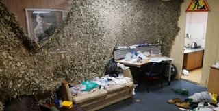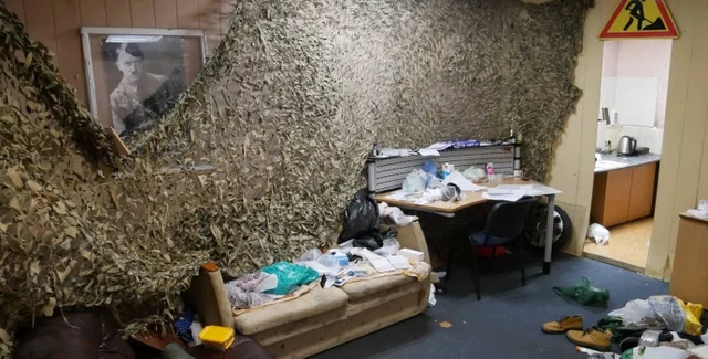 По данным издания, внутри помещения лежат разбросанные паспорта добровольцев, в том числе российский, на стенах свастика и портрет Гитлера.