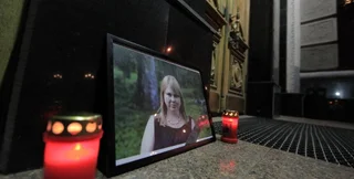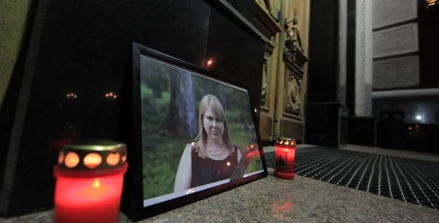 Спустя некоторое время участники акции разошлись, оставив портрет Кати и зажженные свечи у входа в здание.