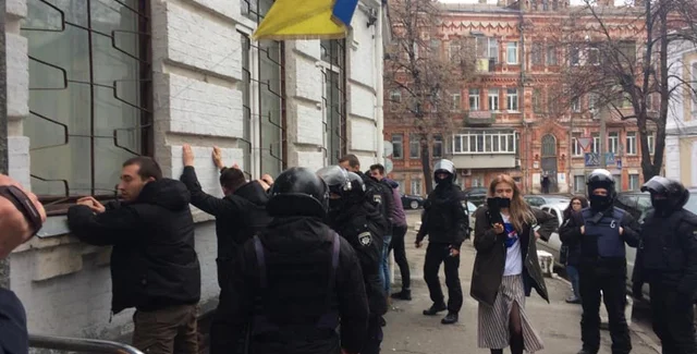 Это произошло после того, как с Контрактовой площади к управлению полиции доставили группу лиц, задержанных на одной из политических акций с зеленкой, ножами, газовыми баллончиками и пистолетом.