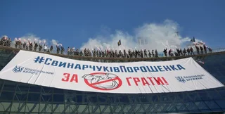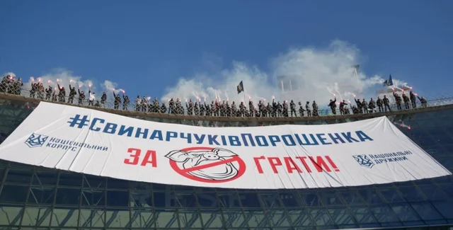 Отмечается, что перед маршем активисты вывесили на ТЦ "Глобус" баннер "СвинарчуковПорошенко за решетку" - "как напоминание о том, что у власти находятся воры, которые нагло разворовывают военный бюджет страны".