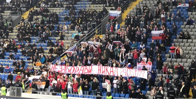 Надпись на сербском языке на растяжке болельщиков гласила: "Не забудем никогда 24.03.1999".