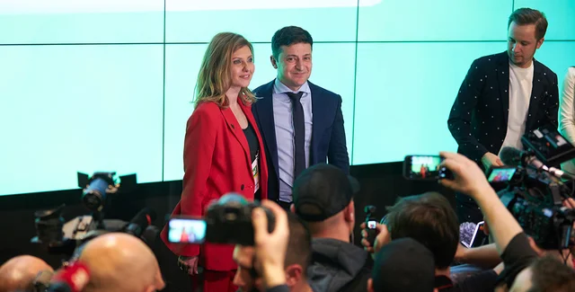 В 20:00 в окружении десятков камер и трех десятков людей Владимир Зеленский буквально, прорывается на сцену. Его жена Елена, одетая во все красное, заметно нервничает. Со стороны кажется, что нервничает и сам Зеленский. Он смущенно улыбается, и шутит, что такого количества телекамер никогда не видел. Действительно, на него смотрит порядка пяти десятков объективов, среди которых много иностранных медиа. Настает Час Че, а скорее Зе и на экране появляются первые данные КМИС. Согласно ним Владимир Зеленский получает 30,4%, Петр Порошенко - 17,8%, Юлия Тимошенко - 14,2%. И тут зал разрывает. Люди с бейджами Зе!Команда начинают истерично обниматься и поздравлять друг друга. У самого Владимира Зелинского слезы на глазах. То ли это действительно эмоции, то ли актерское мастерство, но выглядит вполне искренне. Будто не слыша вопросов и поздравлений, он "начинает давать всем пять" и лишь растерянно улыбаться. После берет себя в руки, становится рядом с женой и дает брифинг.