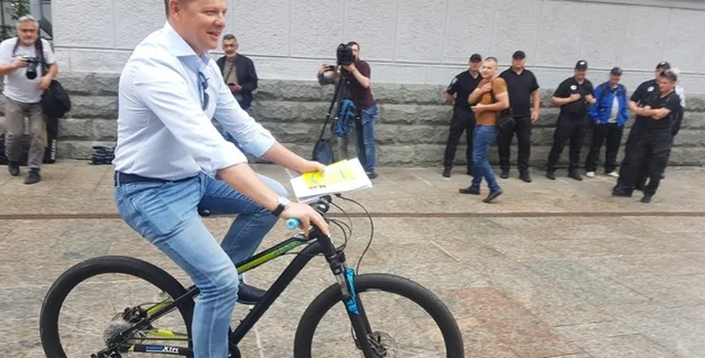 Лидер Радикальной партии Олег Ляшко приехал на велосипеде на встречу глав парламентских фракций с президентом Владимиром Зеленский по вопросу роспуска Верховной Рады. Соответствующее видео он опубликовал в Facebook.