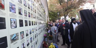 Когда депутаты были у стены, на Михайловской площади прошел молебен в память о павших героях. Также они пообщались с родственниками погибших и с ветеранами.