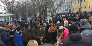 В 8 утра в центре Киева еще не людно, улицы становятся оживленными примерно на час позже. Тем более странно смотрелась внушительная толпа, заполнившая тротуар от Майдана до гостиницы "Днепр". Публика тут собралась разновозрастная, мужчин примерно вдвое больше, чем женщин. Так выглядела одна из точек сбора массовки для очередного проявления "народного гнева".