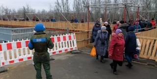 Пропускной пункт "Майорск", который в народе прозвали воротами на оккупированную территорию. Ежедневно его пересекают до 15 тыс. человек. В основном это старики, которым надо получить или переоформить пенсию. Ситуацией пользуются перевозчики. Таксисты наматывают круги вокруг группки пенсионеров.