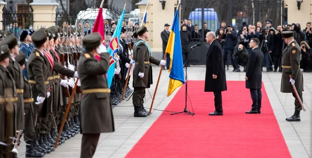 Президент Турции Реджеп Тайип Эрдоган во время официальной церемонии встречи с украинским президентом Владимиром Зеленским на площади возле Мариинского дворца поздоровался с почетным караулом словами "Слава Украине".