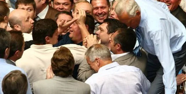 Сразу после этого началась драка, которая сопровождалась нецензурными выражениями. Во время драки депутаты свалили государственный флаг Украины, который стоит возле трибуны.