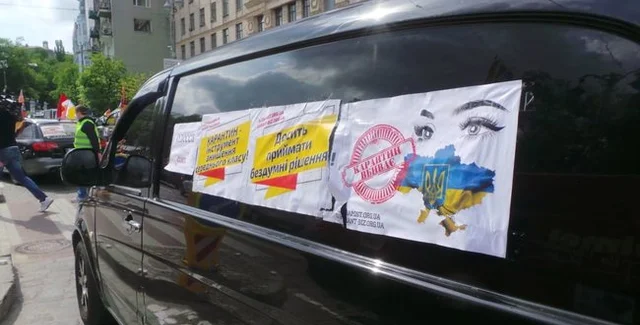 На машинах наклеены баннеры: "Нет уничтожению малого бизнеса", "Справедливость для всех", "Карантин убивает", "Открыть рынки страны", "Защити ФЛП", "Хватит принимать бездумные решения", "Сиди дома сам", "Эпицентры над законом?", "Кабмин на карантин", "Не работаем - не платим" и другие. Участники акции заявляют, что работу малого и среднего бизнеса нельзя останавливать даже во время карантина.