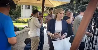 Кандидат в мэры Киева народный депутат от "Слуги народа" Ирина Верещук сегодня вышла на контакт с трудящимися, и угостила конфетами журналистов, снимающих протесты под Радой.