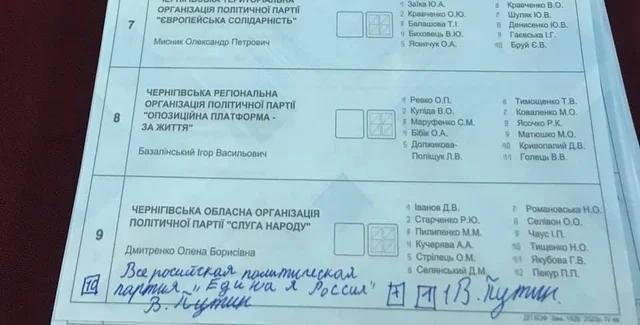 В Чернигове избиратель испортил бюллетень, дописав в него партию "Единая Россия" и фамилию российского президента Владимира Путина. Об этом сообщил кандидат в депутаты Черниговского городского совета Игорь Полуян на своей странице в Facebook.