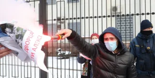 Как сообщает "РБК-Украина", к участникам акции подошли около двух десятков мужчин, которые рвали и поджигали плакаты в поддержку Навального. Также они жгли фаеры.