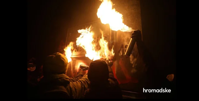 Полиция хотела оттеснить протестующих от входа в ОП, но те начали бросать в полицейских файеры, и правоохранители отступили.