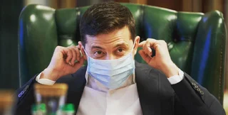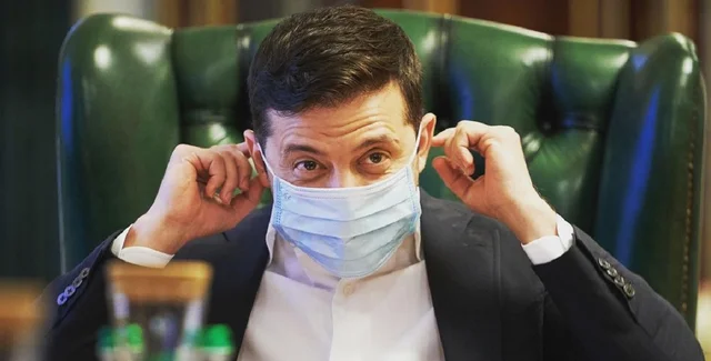 Владимир Зеленский разместил в микроблоге фотографию, на которой поправляет маску за столом в Офисе президента. Можно заметить, что он весело улыбается человеку за кадром.