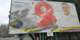 Билборд депутата сопровождается текстом "Благодарим за победу! Благодарим за жизнь!".