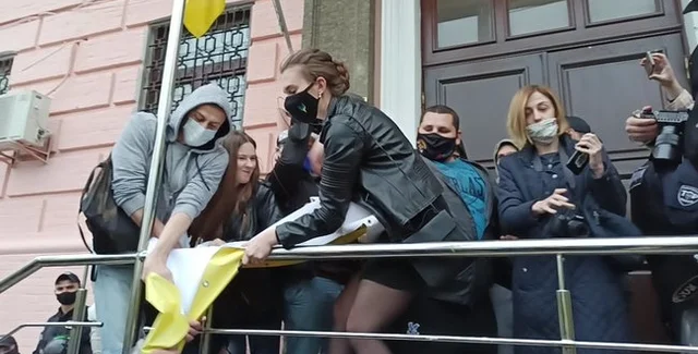 Националисты развернули плакат с надписью "Стус чекає. Медведчук під арешт", а "патриоты за жизнь" попытались его отобрать. В конфликт вмешалась полиция диалога.