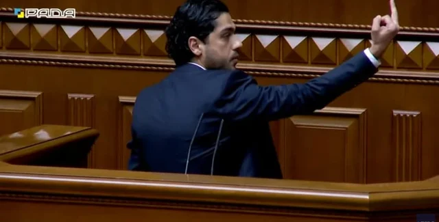 Перед голосованием за назначение Алексея Резникова на должность министра обороны с трибуны Верховной Рады выступал исключенный из "Слуги народа" Гео Лерос, который впоследствии показал президенту средний палец.