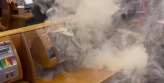 На кадрах можно увидеть белый дым, который идет из пульта для голосования. Нардепы увидели это и поспешили отдалиться.
