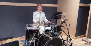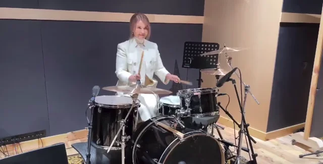 Народный депутат Юлия Тимошенко в окружении музыкантов сидит на барабанной установкой и с энтузиазмом стучит палочками по барабанам и тарелкам.