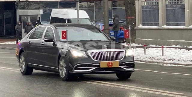 Три Mersedes Maybach, два из которых — с флагами Турции, в сопровождении микроавтобусов Volkswagen заехали на площадь перед Верховной Радой.