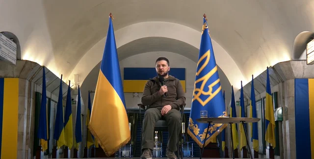Президент Украины Владимир Зеленский дал пресс-конференцию в киевском метро по поводу двух месяцев полномасштабной войны России против Украины.