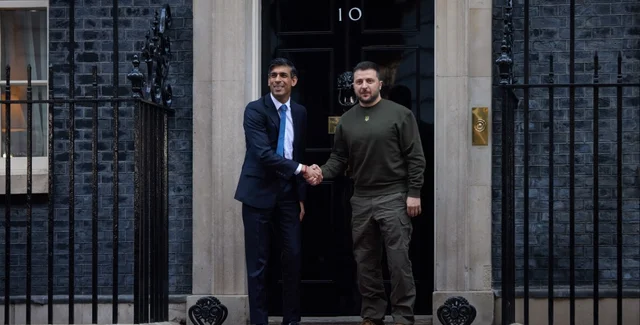 Самолет президента Украины в Лондоне лично встречал британский премьер-министр Риши Сунак. Вместе с ним в аэропорту были министр обороны Бен Уоллес, посол Украины Вадим Пристайко и посол Британии в Украине Мелинда Симмонс.