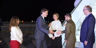 Премьер Канады опубликовал видео, на котором президент Владимир Зеленского и его жена Елена Зеленская выходят из самолета. Джастин Трюдо дважды поцеловал первую леди в щеку и пожал руку президенту. После этого состоялся короткий разговор между Трюдо и Зеленским.