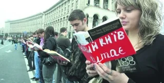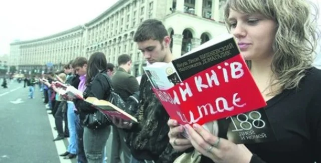 Украинские любители чтения и писатели решили заняться популяризацией книг среди киевлян. 20 минут люди, выстроившись в цепь, читали любимые книги.