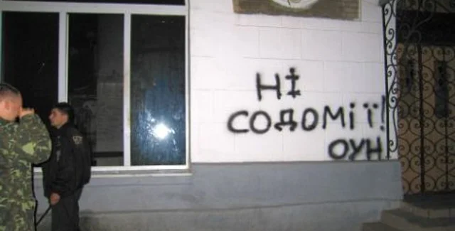 По мнению представителей ОУН, акт вандализма был направлен против проведенного на прошлой неделе диспута "Пропаганда гомосексуализма или пропаганда толерантности?".