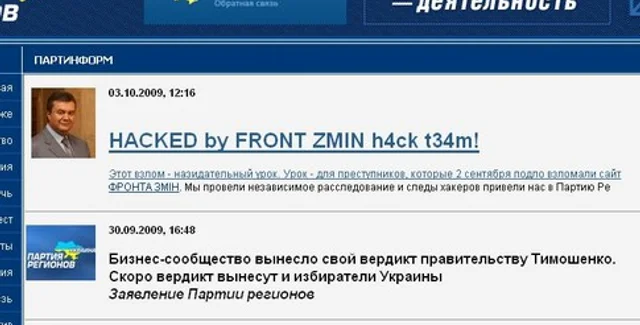 Основной новостью сайта теперь является "назидательный урок" следующего содержания: "Этот взлом – назидательный урок. Урок – для преступников, которые 2 сентября подло взломали сайт ФРОНТА ЗМІН. Мы провели независимое расследование, и следы хакеров привели нас в Партию Регионов. По факту этого преступления наши юристы уже обратились в прокуратуру, и сейчас ведется следствие. Мы не позволим разгуляться криминалу во власти. Те, кто раньше сидели в тюрьме - не могут сейчас быть у власти...