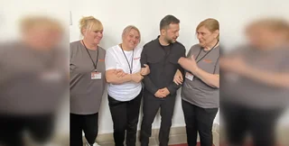 На фото видим трех женщин в, возможно, рабочей одежде, с бейджами на шее. Они держат Зеленского за руки и улыбаются.