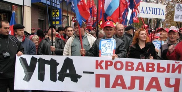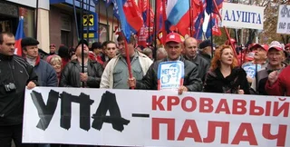 Как сообщает "Сегодня", бойцы милицейского спецподразделения "Беркут" заблокировали митингующих, чтобы не допустить беспорядков. Несколько десятков человек под красными партийными знаменами держат в руках лозунги "УПА - кровавый палач!", "ОУН-УПА - враг Украины", "ОУН-УПА пособники фашизма".