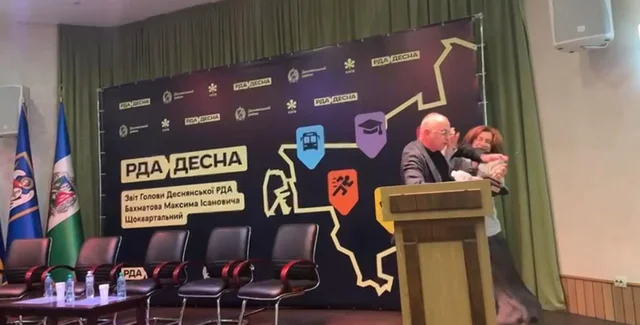Инцидент произошел в помещении Деснянской районной государственной администрации 27 августа, когда Максим Бахматов представлял квартальный отчет о работе. Заместитель председателя Киевской городской государственной администрации, депутат Киевского городского совета Анна Старостенко на своей странице в Facebook утверждает, что глава РГА пригласил ее принять участие в отчете, а в ответ на просьбу ответить на манипулятивные высказывания в ее адрес "позволил себе откровенное психологическое давление".