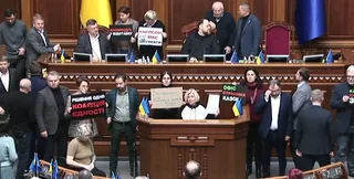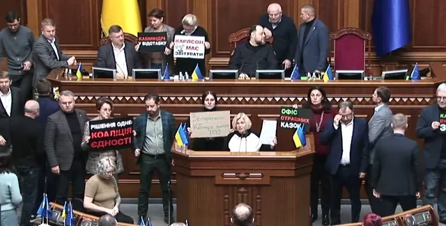 О блокировании трибуны в Верховной Раде стало известно из трансляции сессии на официальном YouTube-канале 19 ноября. О том, что депутаты "ЕС" заблокировали трибуну, и одновременно заседание прервала воздушная тревога, сообщила также нардеп Марьяна Безуглая.