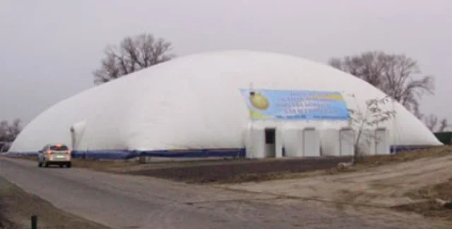 Внешне конструкция напоминает крытый каток. У входа висит табличка с надписью "Посольство благословенного царства божьего для всех народов". Местные жители говорят, что соорудили ее за три дня, правда, перед этим два месяца готовили площадку.Рядом с палаткой находится большой пустырь примерно с два футбольных поля, огражденный зеленым забором. Нет сомнений, что именно здесь расположится "ковчег".