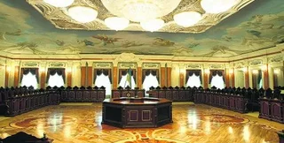 Работы во дворце закончили в октябре прошлого года. Здесь восстановили лепнину, обновили позолоту, покрыли полы гранитом и дорогим паркетом, а в арках установили огромные скульптуры Справедливости, Милосердия, Храбрости и Рассудительности.