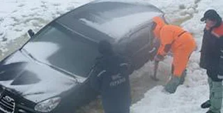 На место происшествия прибыли бойцы аварийно-спасательного отряда специального назначения МЧС. Применив автокран, в течение нескольких часов с помощью специальной лебедки они вытащили машину сначала на лед, а затем на берег.
