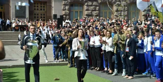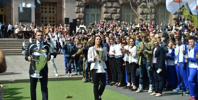 Торжественная церемония передачи кубков послами финалов чемпионатов Андреем Шевченко и Ией Андрущак в руки мэра Киева Виталия Кличко и президента ФФУ Андрея Павелко прошла на Крещатике возле здания КГГА.